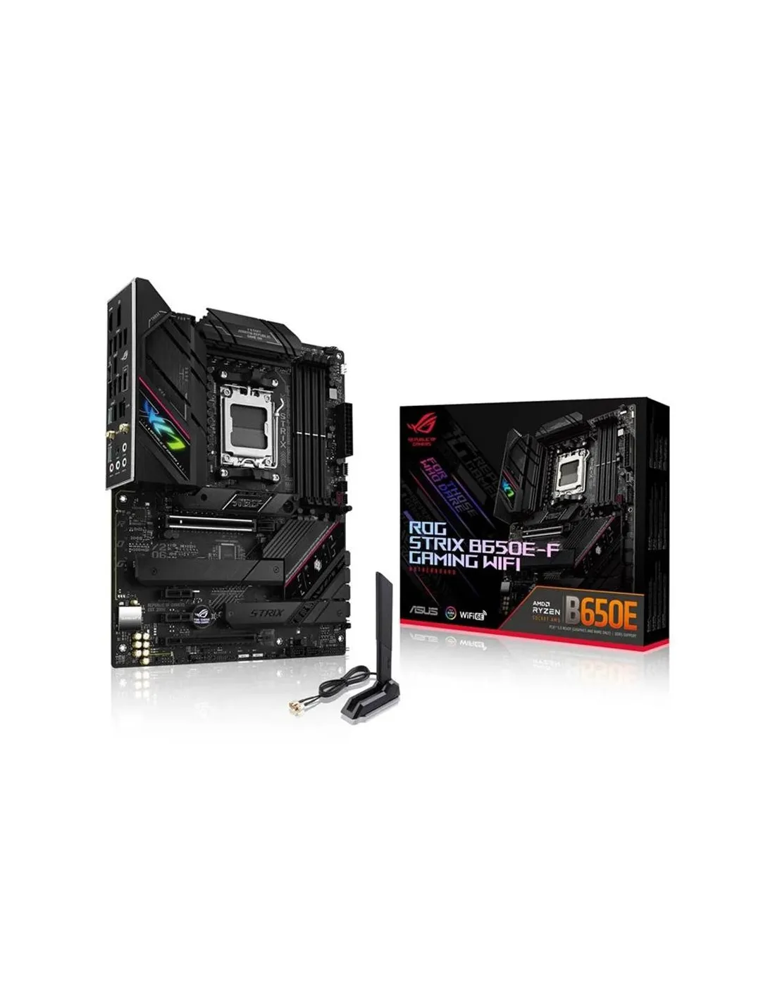 - ASUS ROG STRIX B650E-F GAMING WIFI. PROCESSOR MANUFACTURER: AMD, PROCESSOR SOCKET: SOCKET AM5, COMPATIBLE PROCESSOR SERIES: AMD RYZEN 7. SUPPORTED MEMORY TYPES: DDR5-SDRAM, MAXIMUM INTERNAL MEMORY: 128 GB, MEMORY SLOTS TYPE: DIMM. SUPPORTED STORAGE DRIVE