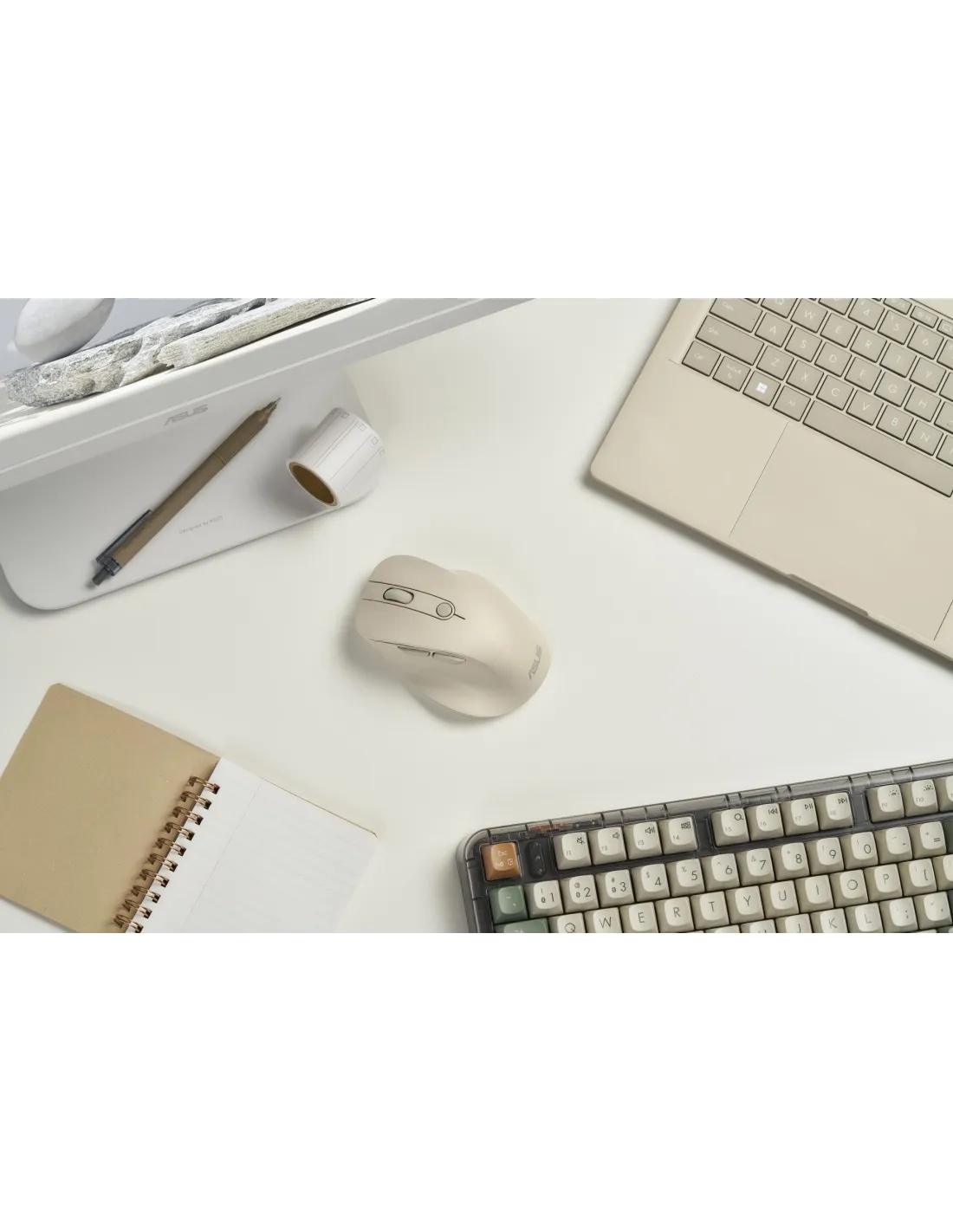 - ASUS MD105 MOUSE/MK-WH. FORM FACTOR: RIGHT-HAND. DEVICE INTERFACE: RF WIRELESS + BLUETOOTH, MOVEMENT RESOLUTION: 2400 DPI, SCROLL TYPE: WHEEL. POWER SOURCE: BATTERIES. PRODUCT COLOUR: BEIGE