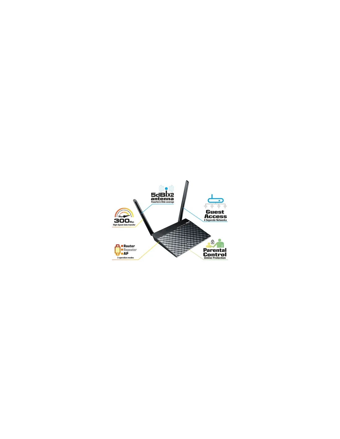Router | RT-N12E | 802.11n | 300 Mbit/s | 10/100 Mbit/s | Ethernet LAN (RJ-45) ports 4 | Mesh Support No | MU-MiMO No | No mobile broadband | Antenna type 2xExternal 5dBi | No USB | 36 month(s)