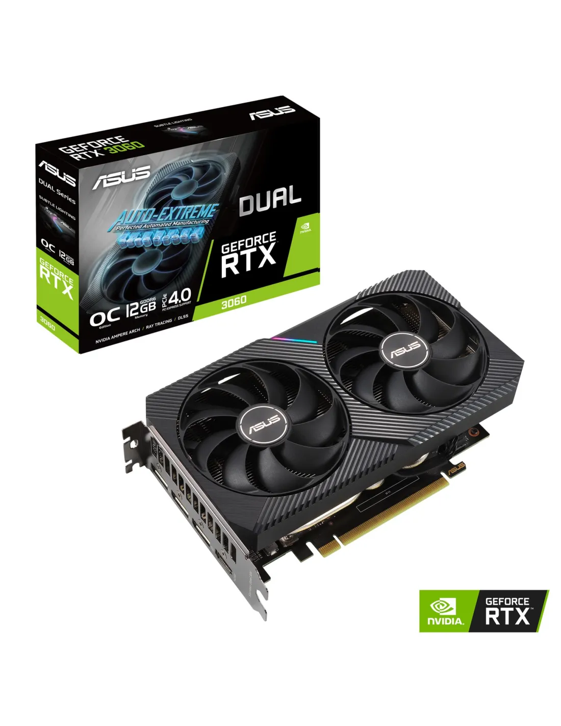 - ASUS DUAL -RTX3060-O12G-V2. GRAPHICS PROCESSOR FAMILY: NVIDIA, GRAPHICS PROCESSOR: GEFORCE RTX 3060. DISCRETE GRAPHICS CARD MEMORY: 12 GB, GRAPHICS CARD MEMORY TYPE: GDDR6, MEMORY BUS: 192 BIT. MAXIMUM RESOLUTION: 7680 X 4320 PIXELS. DIRECTX VERSION: 12 U