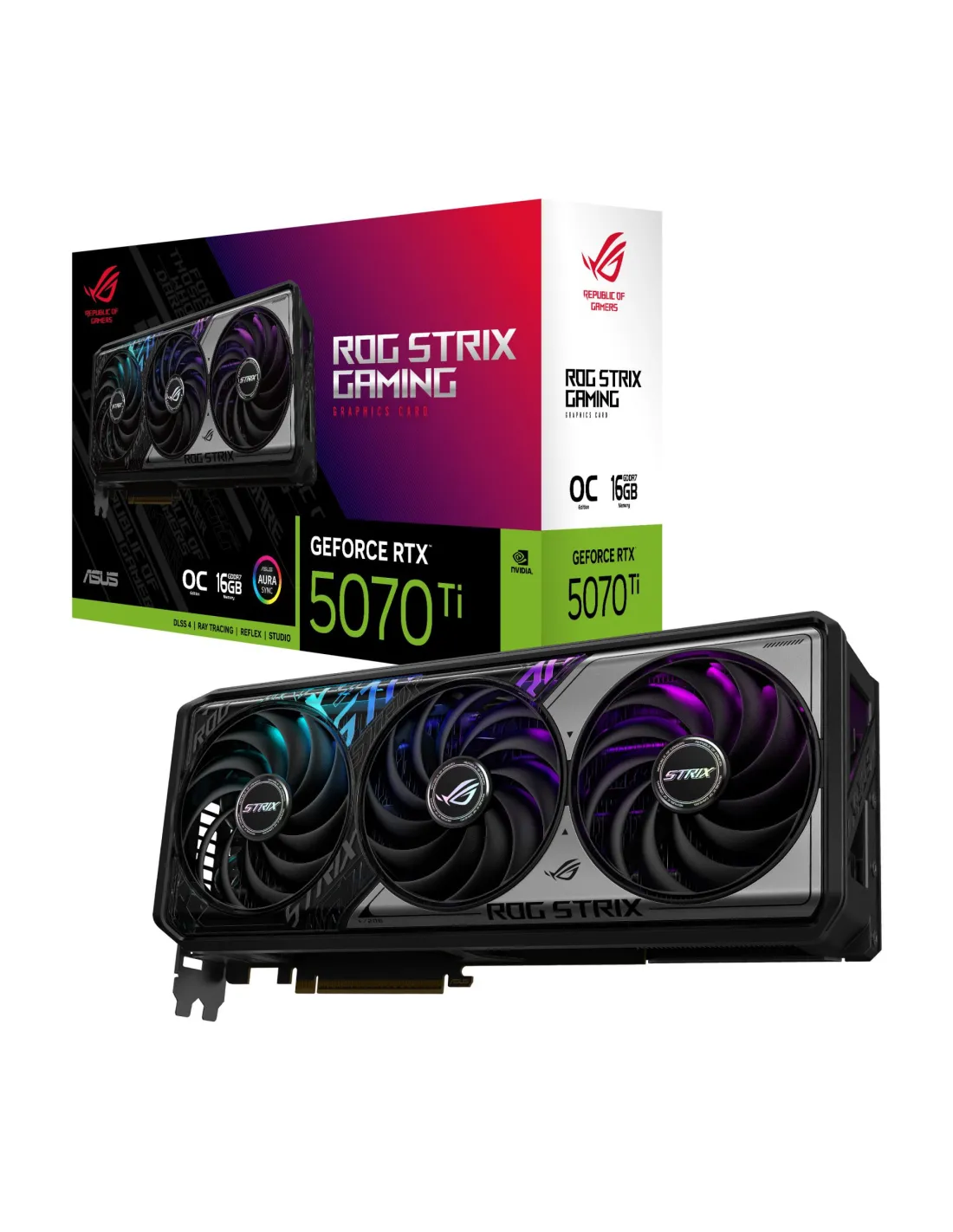 - ASUS ROG -STRIX-RTX5070TI-O16G-GAMING. GRAPHICS PROCESSOR FAMILY: NVIDIA, GRAPHICS PROCESSOR: GEFORCE RTX 5070 TI. DISCRETE GRAPHICS CARD MEMORY: 16 GB, GRAPHICS CARD MEMORY TYPE: GDDR7, MEMORY BUS: 256 BIT. MAXIMUM RESOLUTION: 7680 X 4320 PIXELS. OPENGL