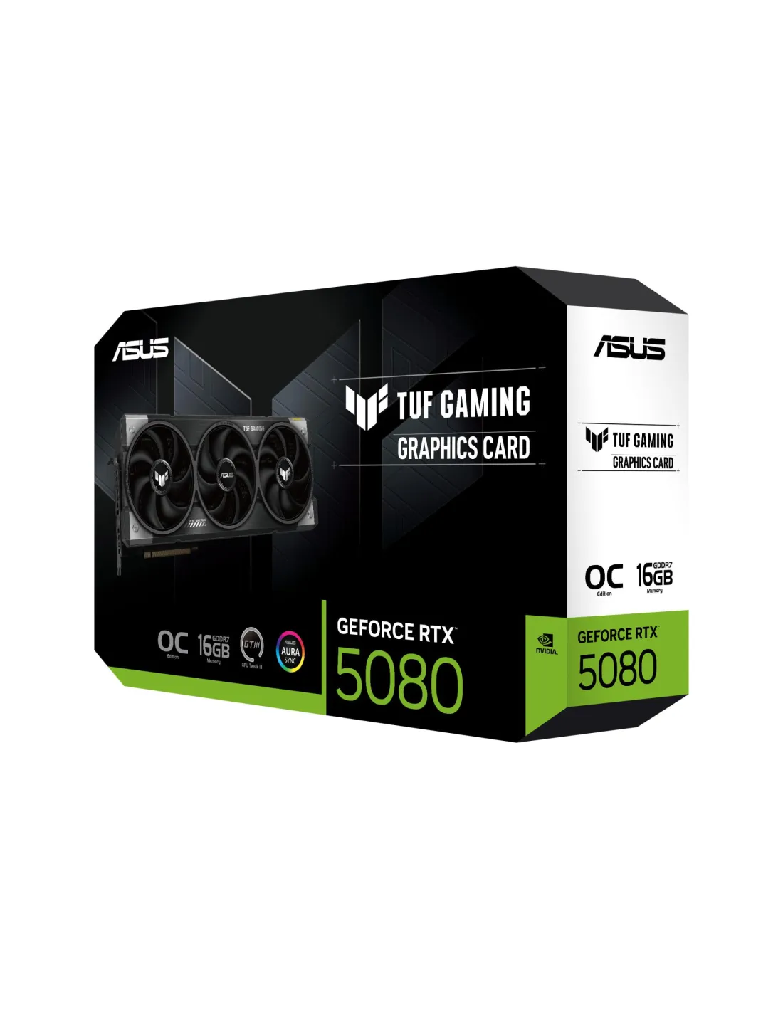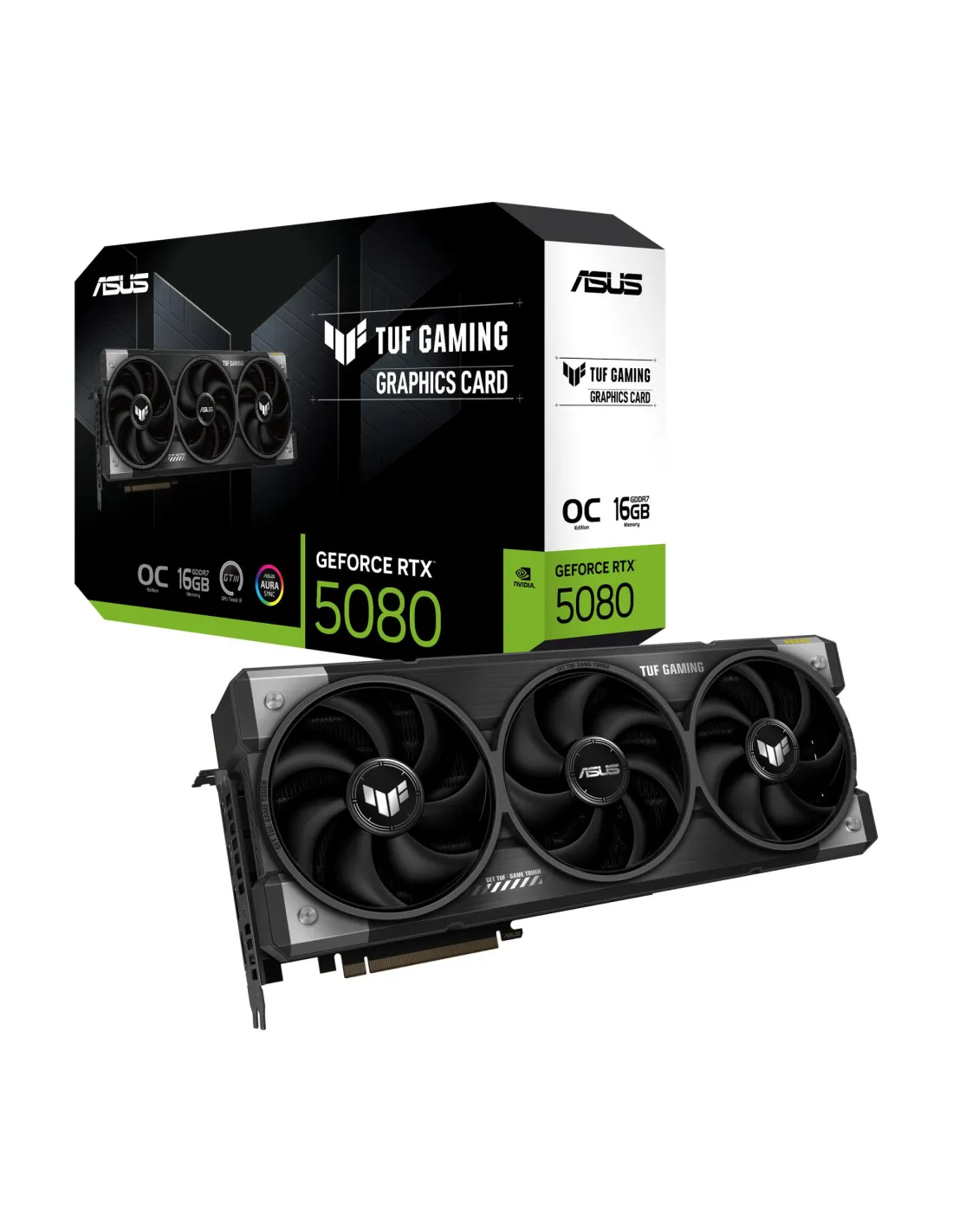 - ASUS TUF GAMING TUF-RTX5080-O16G-GAMING. GRAPHICS PROCESSOR FAMILY: NVIDIA, GRAPHICS PROCESSOR: GEFORCE RTX 5080. DISCRETE GRAPHICS CARD MEMORY: 16 GB, GRAPHICS CARD MEMORY TYPE: GDDR7, MEMORY BUS: 256 BIT. MAXIMUM RESOLUTION: 7680 X 4320 PIXELS. OPENGL V